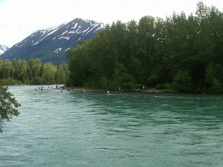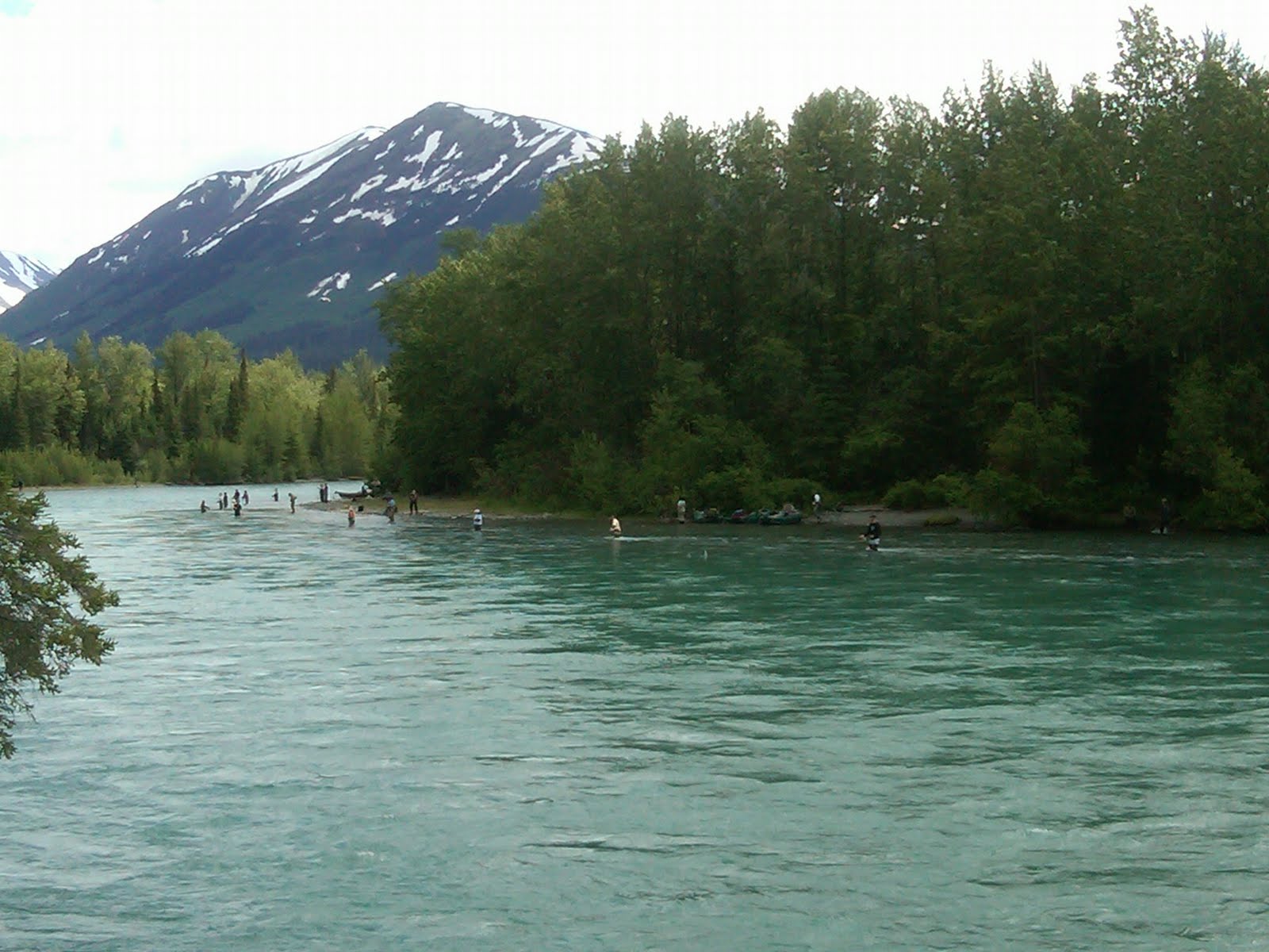 Hundreds of fly fishermen compete with bears for fish at Russian River in Kenai National Park Alaska.